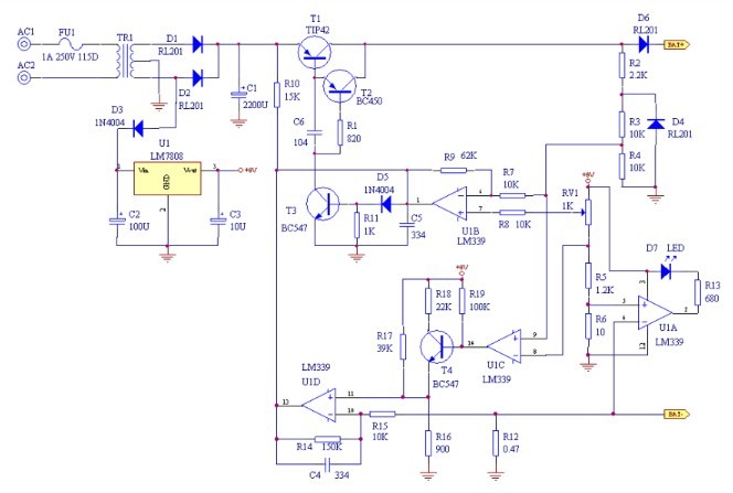 ? ? ? ?本電路設(shè)有反極性保護(hù)電路,山D4, U1C, U1D, T1及外圍元件構(gòu)成,當(dāng)電池反接時(shí),充電器限制輸出電流不致發(fā)生事故。充電指示山U1A. D7及外圍元件構(gòu)成,充電時(shí),D7點(diǎn)亮,充電器進(jìn)入浮充狀態(tài)后,D7熄滅,表示充電結(jié)束。