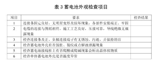 ? ? ? ?逐個(gè)目測(cè)檢查蓄電池外觀.不應(yīng)有變形、污跡,蓄電池間連接可靠、無(wú)銹蝕:檢查項(xiàng)目和結(jié)果滿足表3要求。