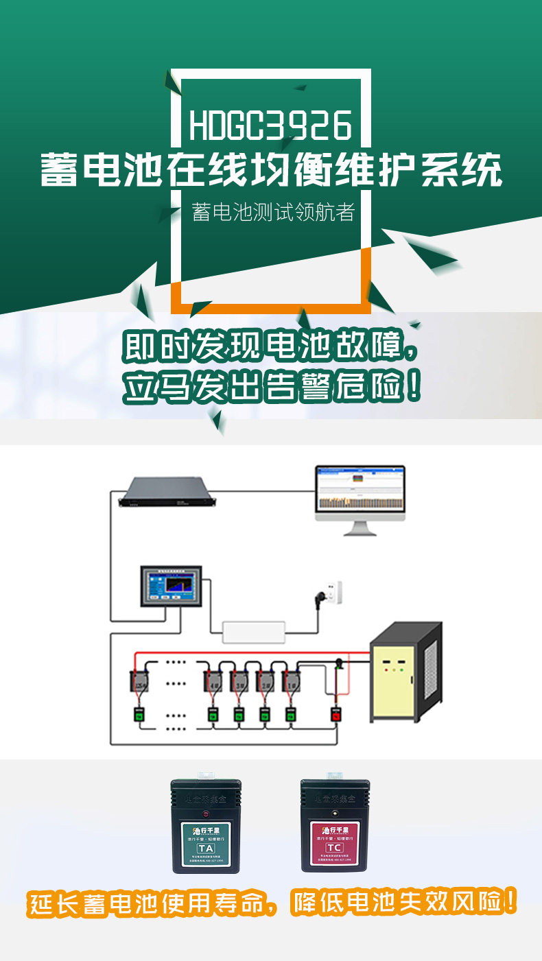 HDGC3926蓄電池在線均衡維護(hù)系統(tǒng)是具備在線自動(dòng)均衡維護(hù)功能,可在浮充狀態(tài)下對(duì)電池組進(jìn)行在線自動(dòng)均衡維護(hù),對(duì)欠充電池自動(dòng)進(jìn)行限壓涓流流補(bǔ)償充電,使每節(jié)電池始終處于活性狀態(tài),保持電池組電壓均衡,防止電池長(zhǎng)期欠充硫化或長(zhǎng)期過充失水。從而減少電池故障,延長(zhǎng)電池壽命。對(duì)直流屏后備電源進(jìn)行全方位的監(jiān)控包括內(nèi)阻測(cè)試、極柱溫度測(cè)試、單體電壓監(jiān)測(cè)、組端充放電壓、電流監(jiān)控及智能分析與管理。